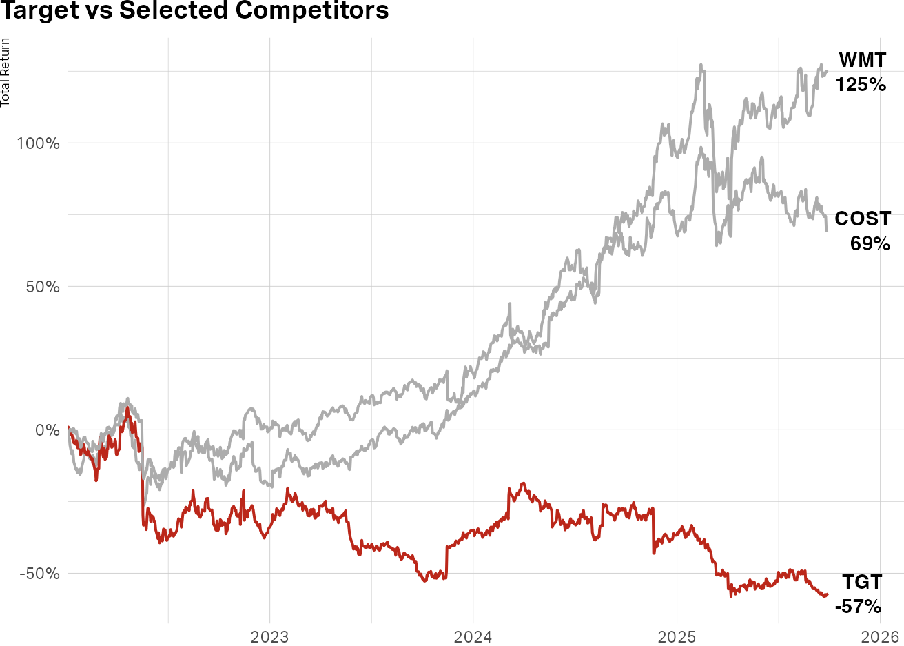 The Target brand has been in trouble for some time. Financially, it’s been weathering rough seas since COVID. If you’d invested $100 in Target on January 3, 2022, it would now be worth just $43. That same $100 in Walmart would be worth $225. In Costco? $169. This brand, which was once celebrated as the reference point for other brands aspiring to achieve the same level of prestige in the zeitgeist, has lost its mojo.