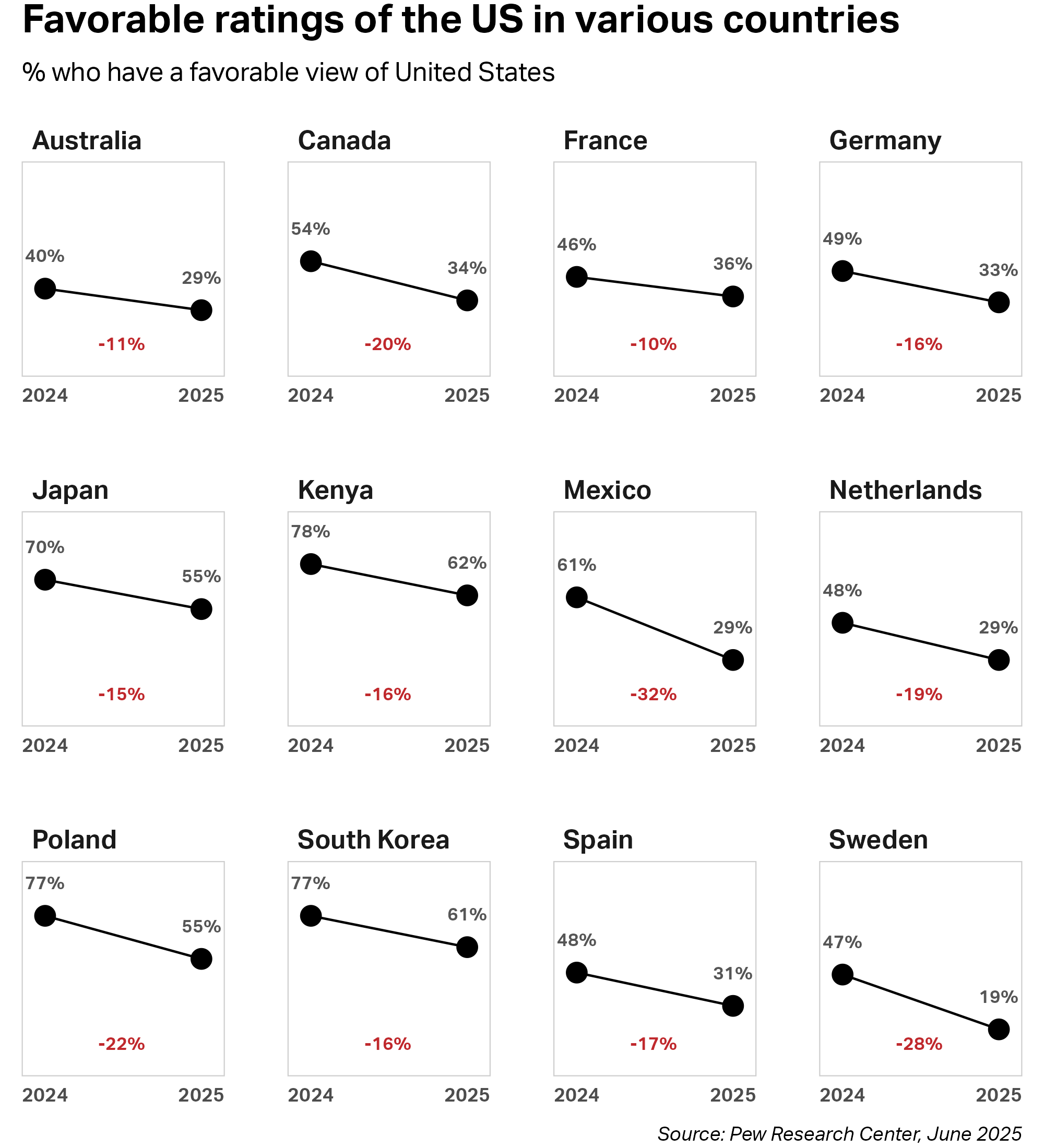 According to a June, 2025 study by the Pew Research Center, U.S. favorability has dropped significantly in fifteen countries since 2024. In Mexico, the decline was thirty-two points—from 61% favorable to 29%. In Canada, twenty points. In Sweden, twenty-eight points.
