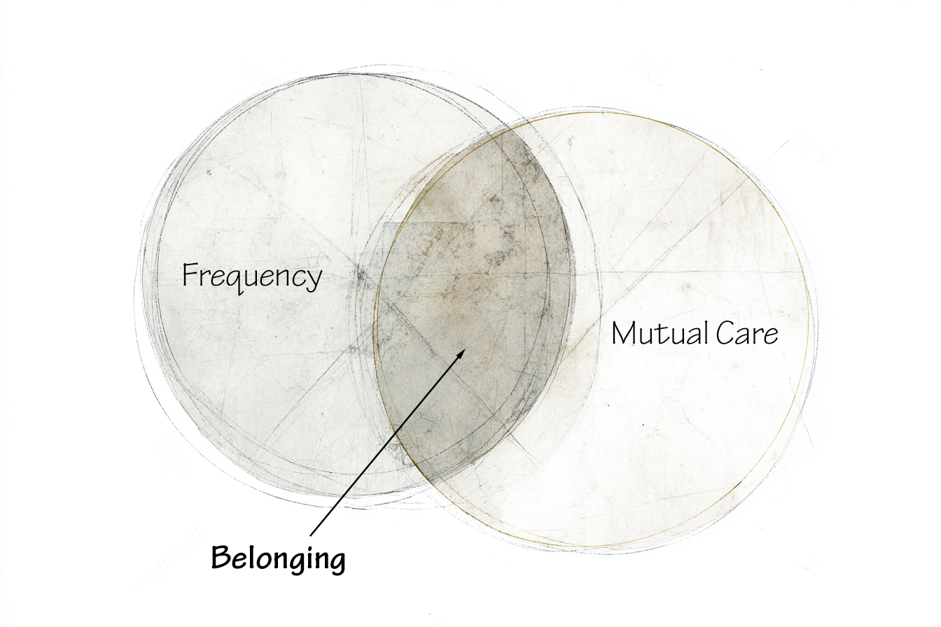 Baumeister and Leary’s need to belong theory identified two conditions that must both be present for the need to be satisfied. First, belonging requires frequent personal contact with others. Second, interactions must take place within relationships characterized by stability and mutual care. Neither condition alone is sufficient. You can have frequent contact with others but belonging won’t surface if the parties don’t exercise reciprocal care. A single interaction of mutual regard won’t deliver it either. The need is only met when both are present, consistently, over time.