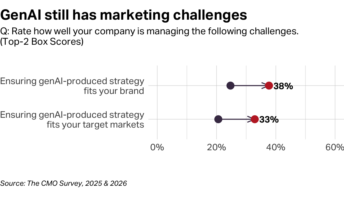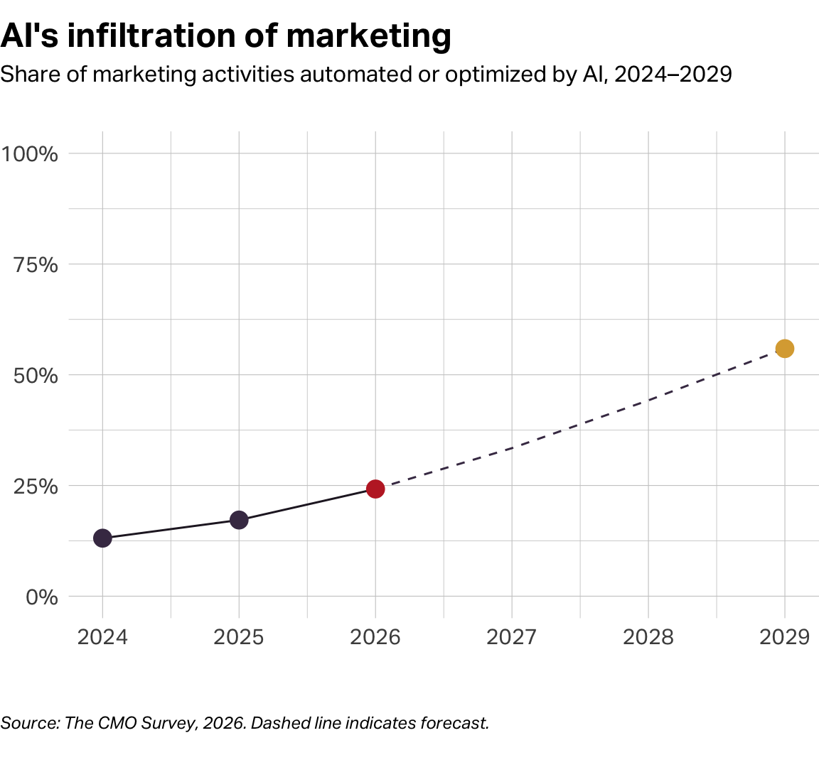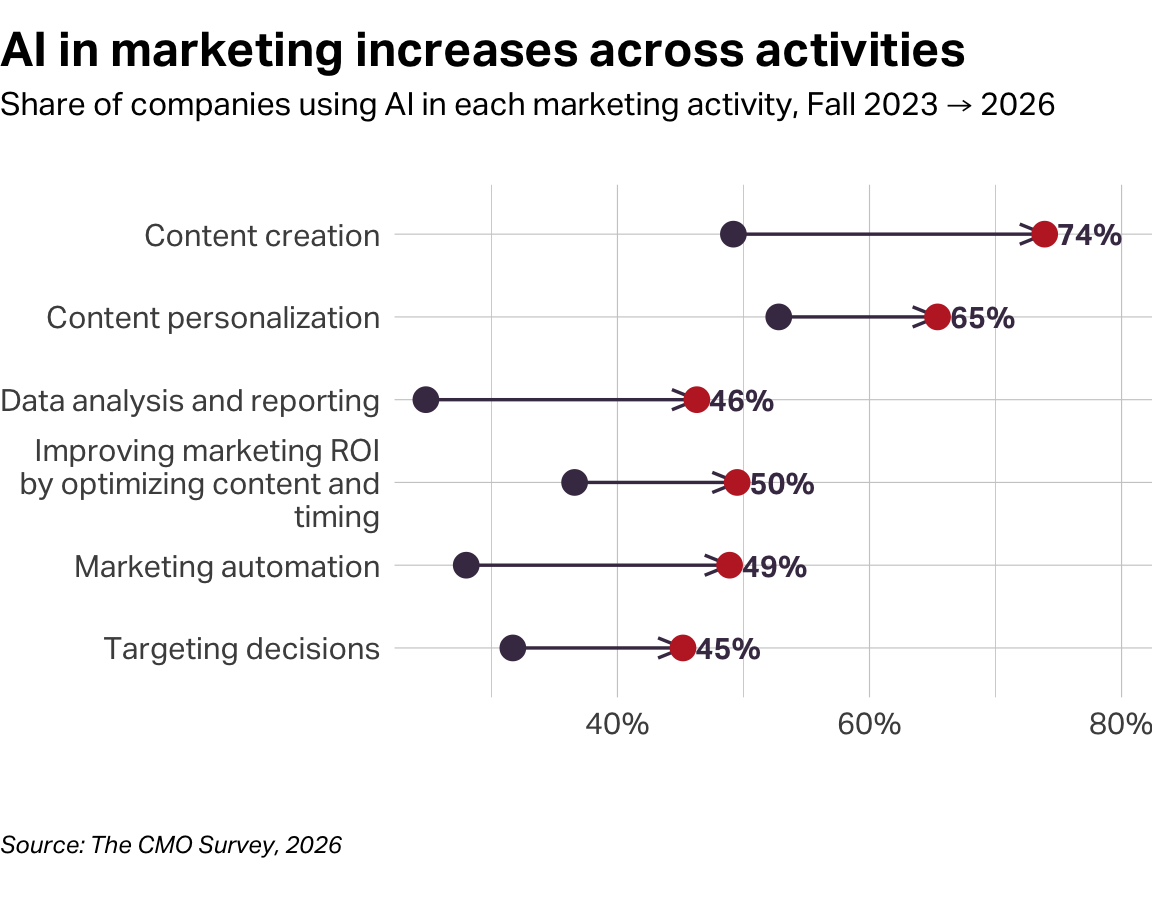 Last year, my friend Jeremy Korst co-authored a great piece for Harvard Business Review that opened with a bold prediction, “among all the managerial functions, marketing is likely to be the one that’s most disrupted by generative AI.” AI’s immediate influence on marketing has emerged like nothing we’ve seen before. In the most recent release of The CMO Survey—a joint project of the American Marketing Association, Deloitte, and Duke University—senior marketers said they were using AI to automate and optimize marketing about 24% of the time, a 40% increase from the 2025 study. The same audience forecast that they will be using the technology for this purpose 56% of the time in 3 years—representing a 131% increase in AI’s power over marketing.