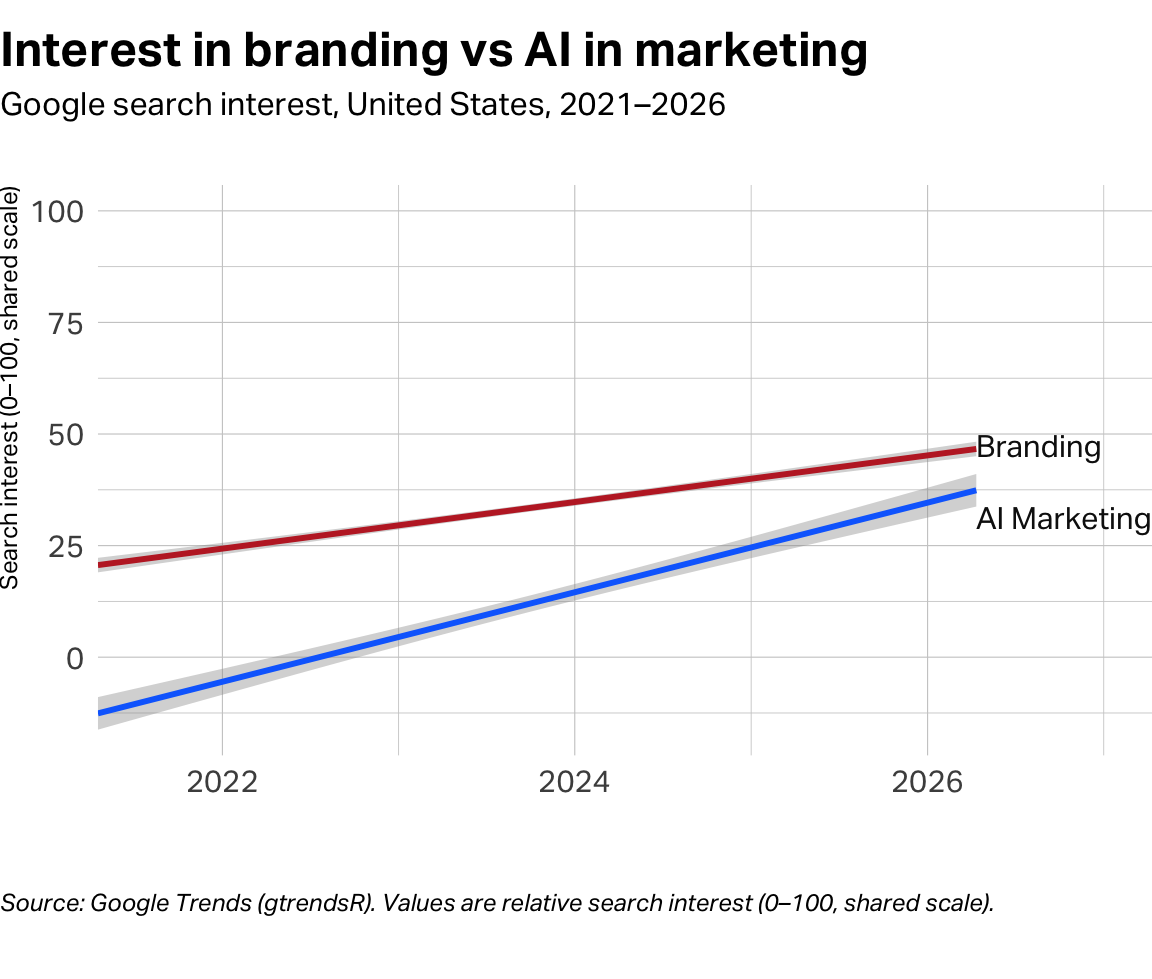 A review of Google search trend data over the past five years shows a growing interest in branding and brand management–one that is strongly correlated with an increase in hits for “AI in marketing.”